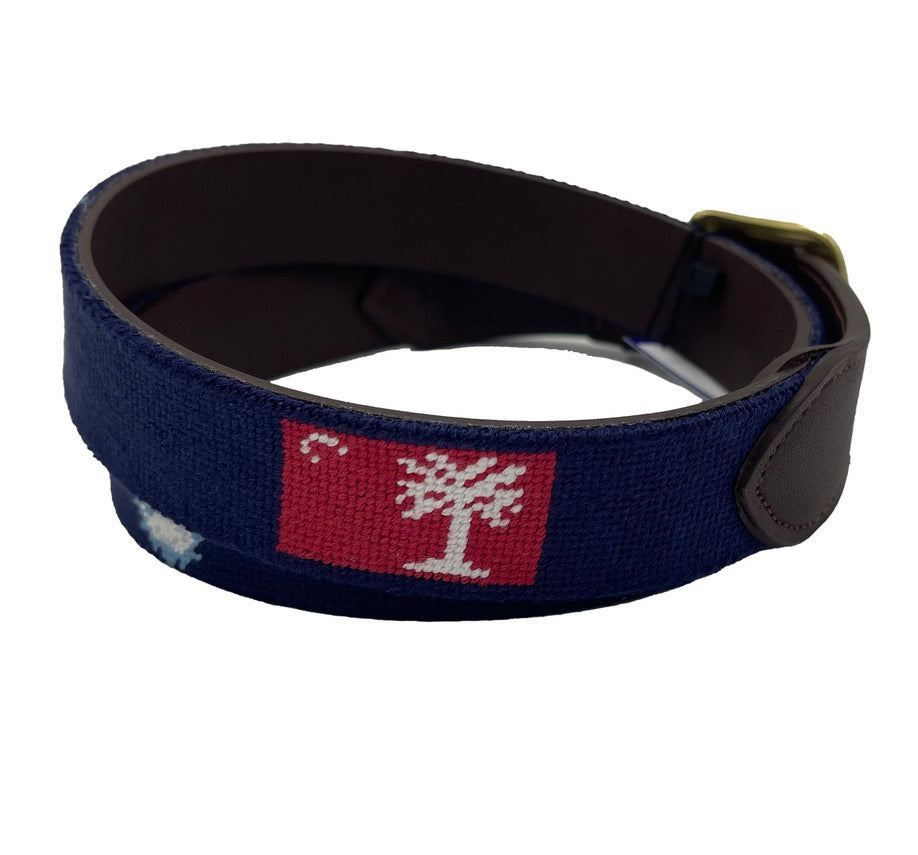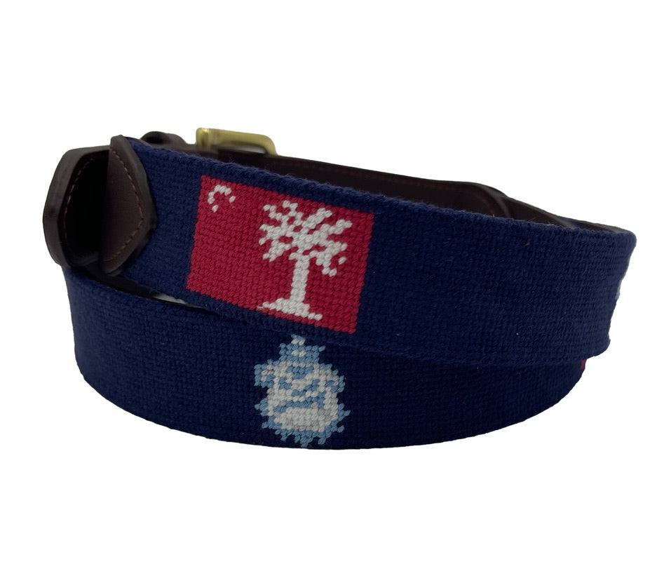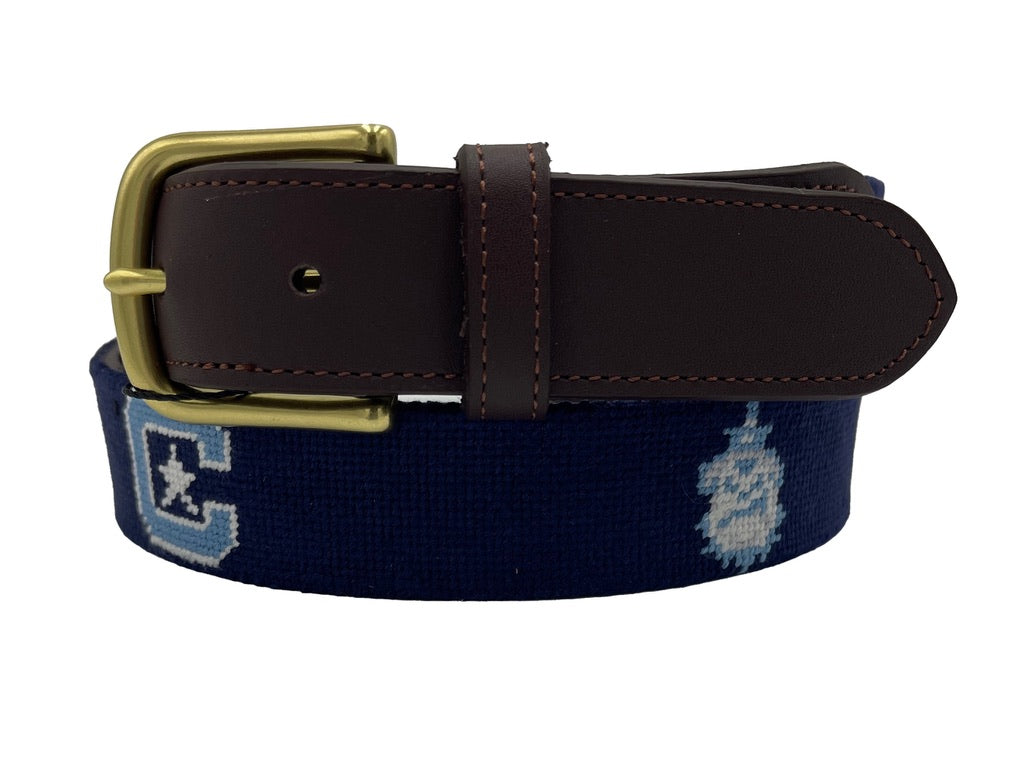 Elevate your style with the Charleston Belt featuring The Citadel logo. Hand-stitched with needlepoint and made with genuine leather, this belt is an attractive statement piece. Dark navy base color featuring school icons Spike, Big Red, and the block C-Star athletics logo.  The solid brass buckle adds a touch of elegance, making it a must-have accessory for any fan. Show your support proudly!  Officially licensed.