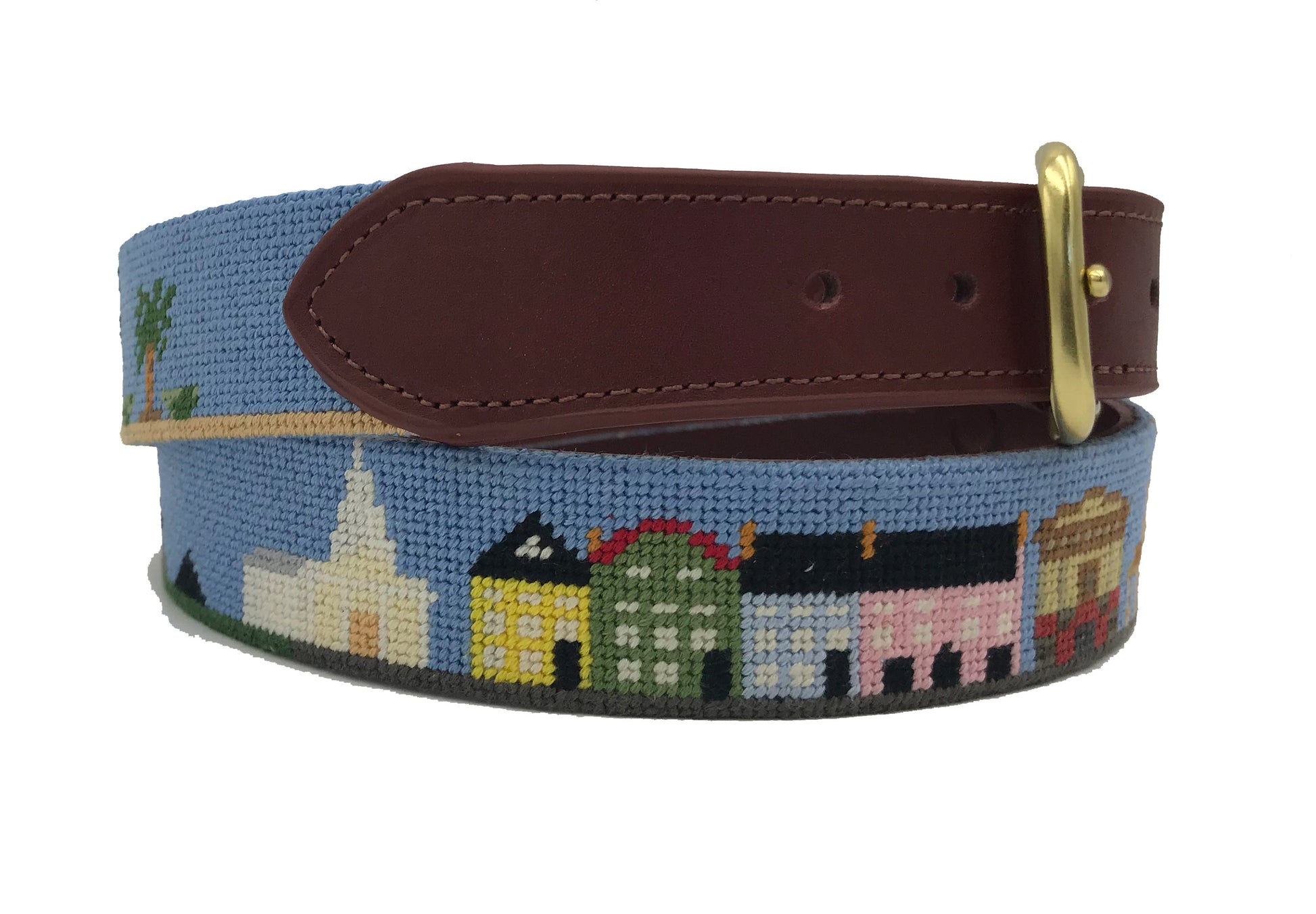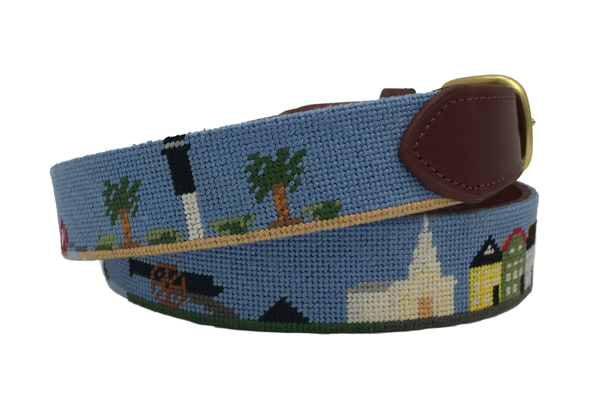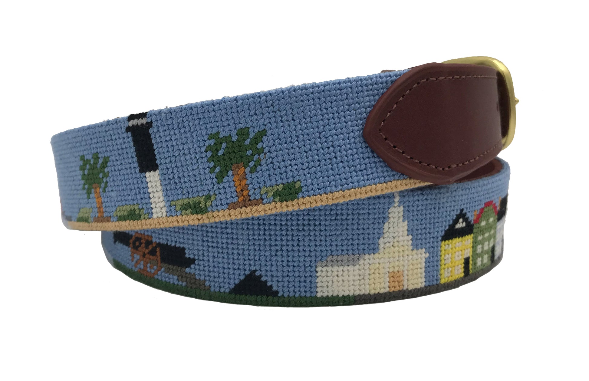 From The Battery to the beach, you'll always carry a bit of Charleston with you while wearing this stunning belt. The beautiful architecture, history, harbor and beaches of Charleston come to life in this hand-stitched needlepoint belt.  The details on the design feature Fort Sumter, the Battery, Rainbow Row, St. Michael's Church, St. Phillip's Church, Old Market building, horse-drawn carriage, Ravenel Bridge, Sullivan's Island lighthouse, and sailboats in the harbor.
