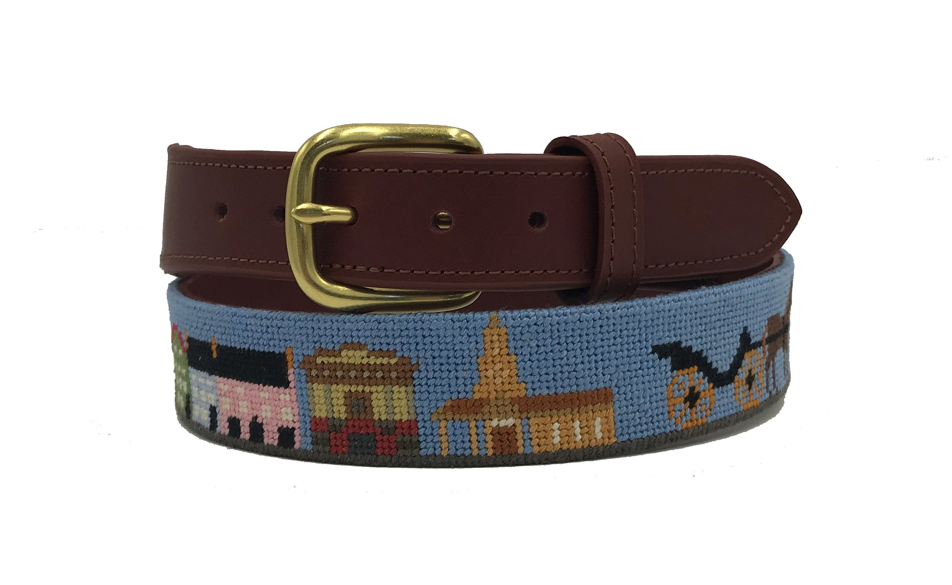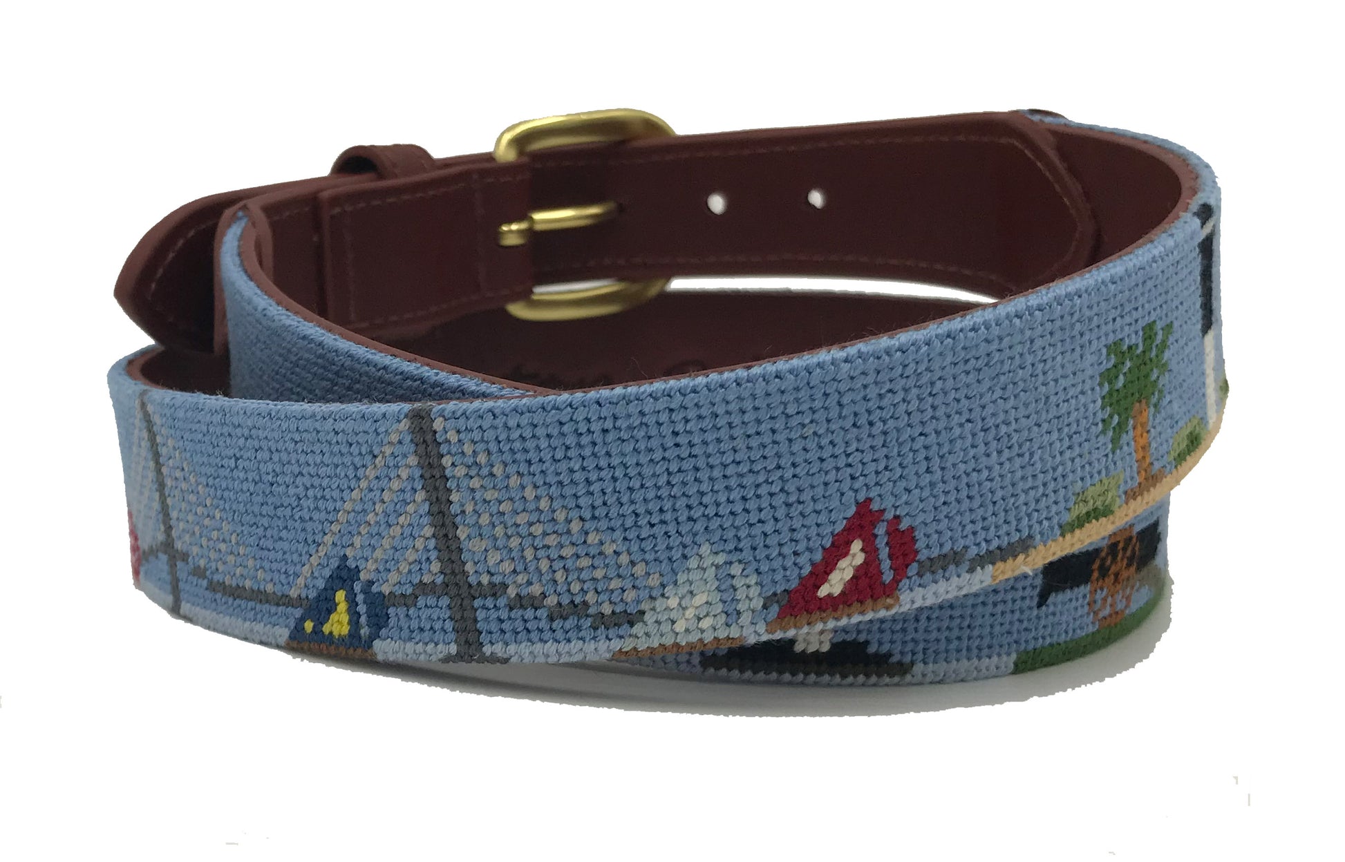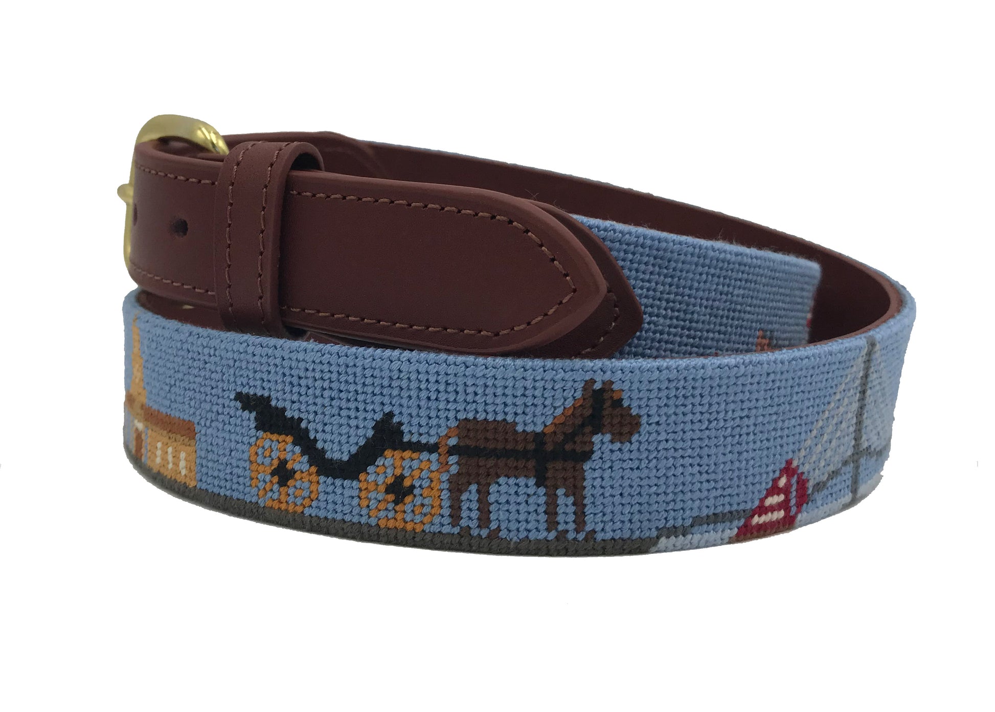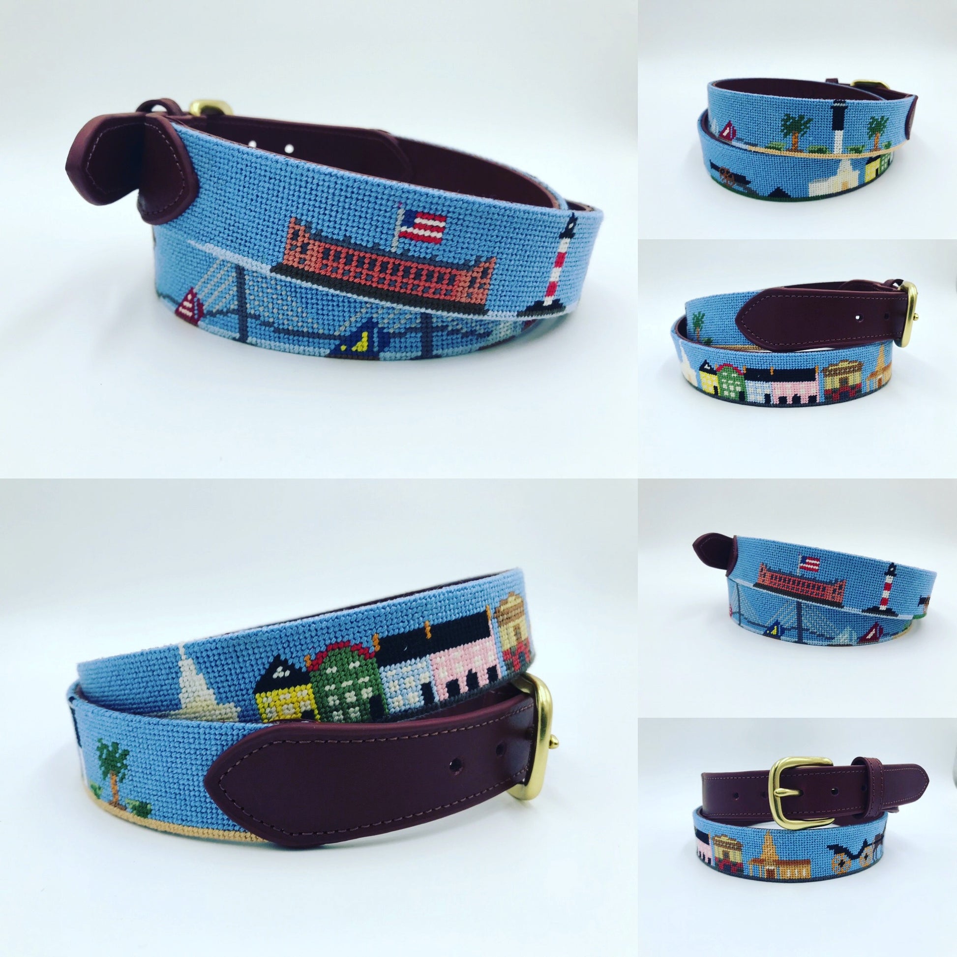 From The Battery to the beach, you'll always carry a bit of Charleston with you while wearing this stunning belt. The beautiful architecture, history, harbor and beaches of Charleston come to life in this hand-stitched needlepoint belt.  The details on the design feature Fort Sumter, the Battery, Rainbow Row, St. Michael's Church, St. Phillip's Church, Old Market building, horse-drawn carriage, Ravenel Bridge, Sullivan's Island lighthouse, and sailboats in the harbor.