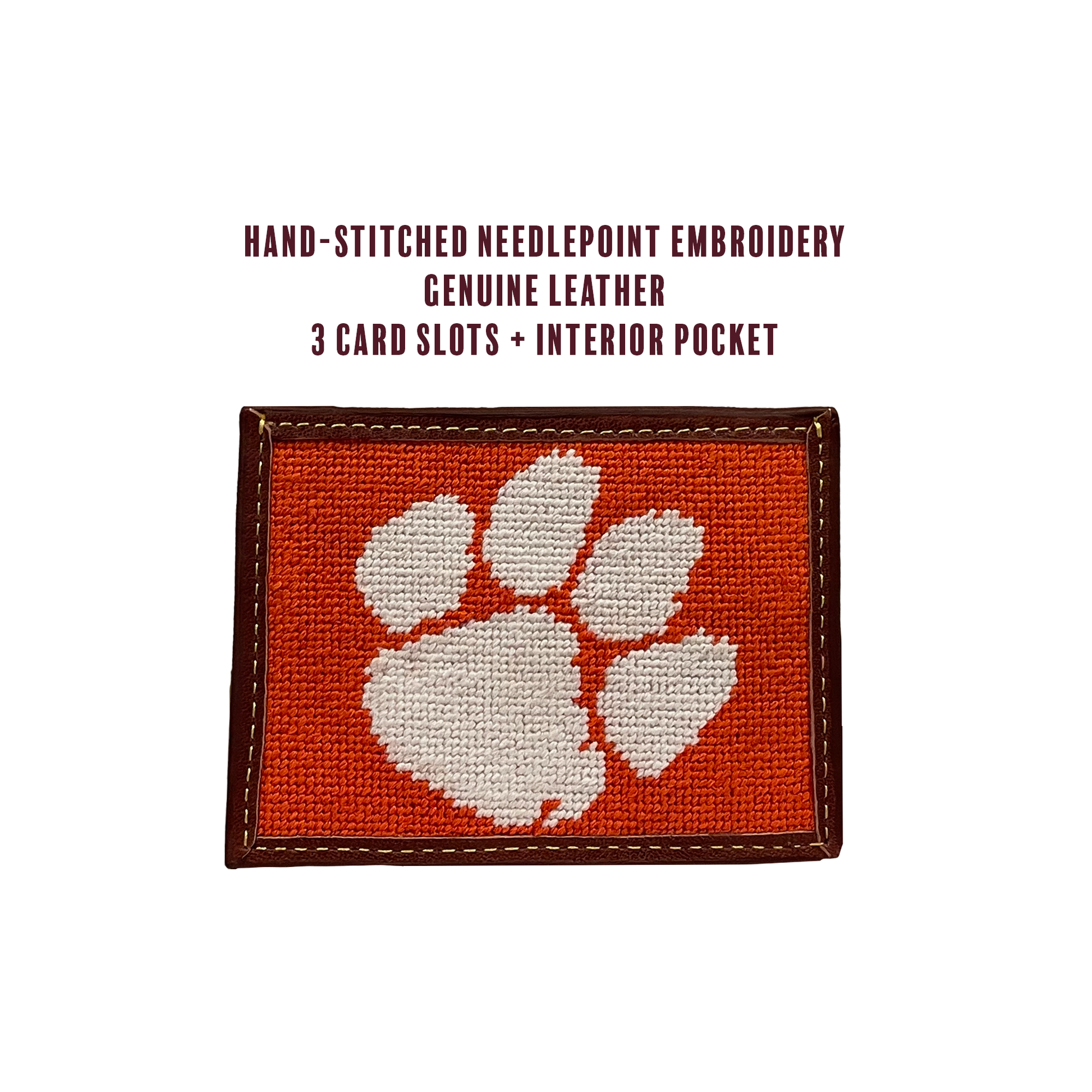 Add some team spirit to your everyday style with this Clemson University Card Wallet. The genuine leather wallet is hand-stitched with the Clemson primary athletic logo, and contains 3 card pockets and an interior coin/bill pocket.  We sew with 100% pearl cotton embroidery threads to provide beautiful colors and texture. The leather is top-stitched with finely detailed contrasting color, all in a great size that fits perfectly in your pocket or bag.  Finished size is 4"x3".  Officially Licensed.  Great gift idea for Clemson alumni and students.