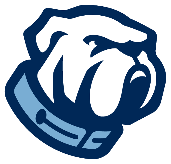 • Dark Baby Blue Stock Design with Cannon - icons include "Spike" bulldog, red/white quadrangle, Citadel Block C with star, 2nd battalion, shako, coveted Citadel ring, and parade cannon (design does not include Big Red)