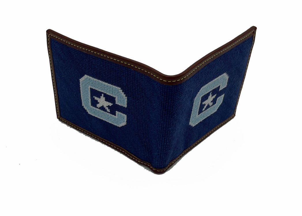 Now Shipping! Add some team spirit to your everyday style with this Citadel C-Star Logo Needlepoint Wallet. The genuine leather wallet is hand-stitched with the Citadel C-Star logo, and contains 6 card pockets and 2 full-length bill pockets.  Top-stitched with finely detailed contrasting threads, all in a great, larger-than-average size.  Finished size is 9"x3.5".  Officially Licensed.