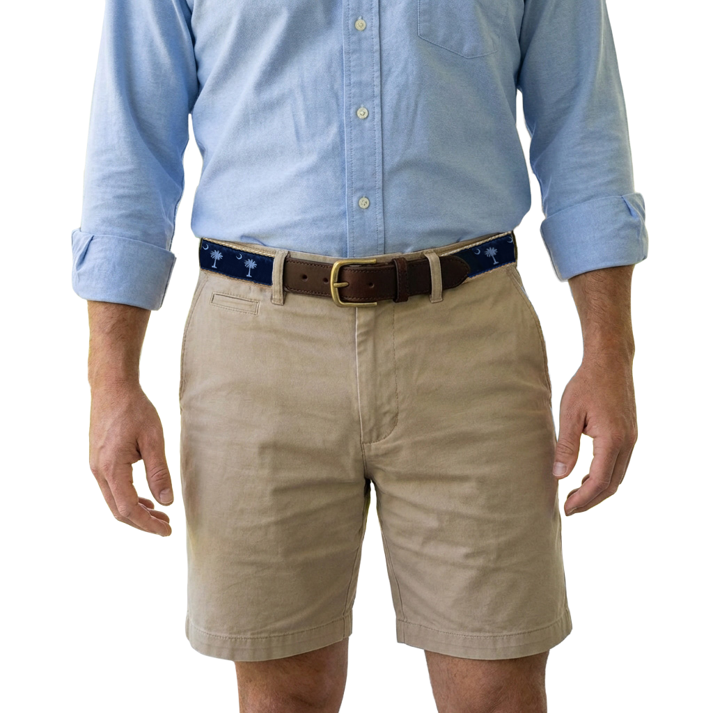 SC State Flag Palmetto Moon Belt Beige Navy Blue Embroidered Woven Web Award Winning Design