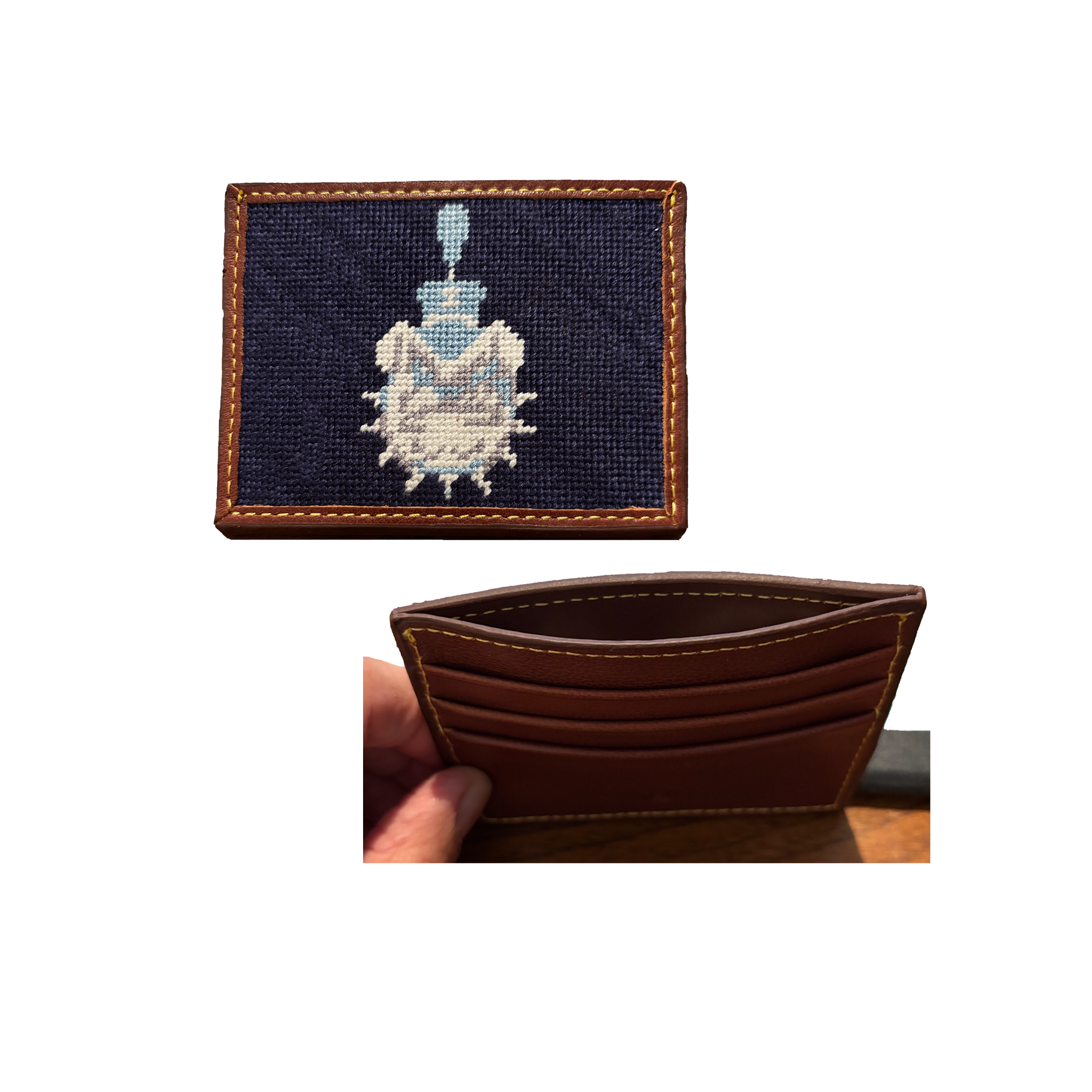 Add some team spirit to your everyday style with this Citadel Spike Needlepoint Card Wallet. The genuine leather wallet is hand-stitched with the Spike bulldog mascot, and contains 3 card pockets and an interior coin/bill pocket.  We use 100% pearl cotton embroidery threads to provide beautiful colors and texture. The leather is top-stitched with finely detailed contrasting color, all in a great size that fits perfectly in your pocket or bag.  Finished size is 4"x3".  Officially Licensed.